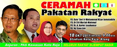 PAS Kawasan Kota Raja selaku penganjur menjemput orang ramai untuk hadir ke Majlis Penerangan dan Ceramah oleh pimpinan Pakatan Rakyat yang akan diadakan seperti butiran berikut :